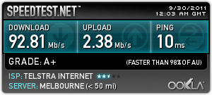 Telstra BigPond Ultimate Cable Home Network Gateway (a Cisco DOCSIS 3.0 cable modem, 802.11n wireless router) installed today. After a few hours of activation issues at Telstra’s Siebel/Mobi implementation, a speed test was performed. Measured results at http://vic.speedtest.bigpond.net.au: 108.9 Mbps down, 2.4 Mbps up on a early 2009 MacBook Pro Core2 Duo 2.93 GHz, 4GB RAM, 256 GB SSD over a wired Ethernet link to the router. iPhone 4 Wi-Fi measurements from Speednet iPhone app: 13.0 Mbps down, 2.27 Mbps up. Well done guys – delivered results exceed advertised performance